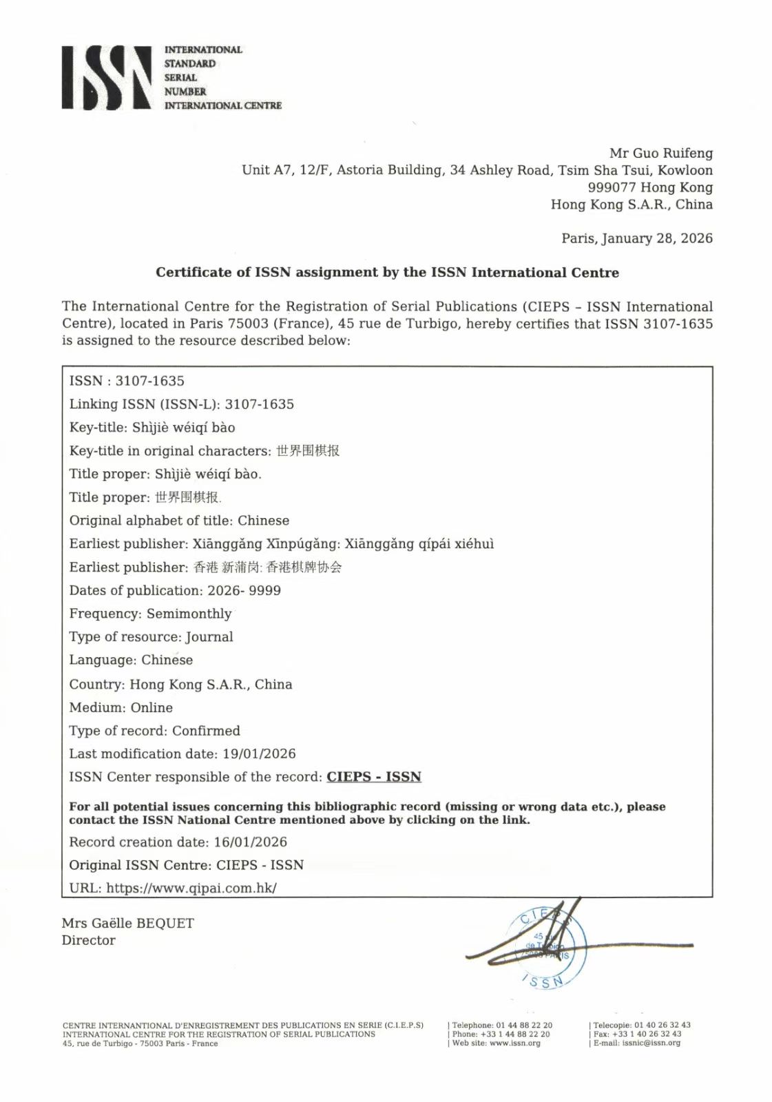向世界讲好中国围棋故事|汉谋集团官方媒体《世界围棋报》正式获批 2026年2月4日 13:55:0715989445187 15989445187 管理员 关注 40文章 0粉丝 官方发布评论84阅读模式 汉谋集团官方媒体《世界围棋报》获批。 恭喜在立春之日迎来这一里程碑! 《世界围棋报》正式获国际ISSN认证,汉谋集团"用围棋连接世界"战略布局再落关键一子。 2026年2月4日,立春时节,万象更新。汉谋集团今日宣布,旗下官方媒体《世界围棋报》(Shìjiè Wéiqí Bào)已正式获得国际标准连续出版物号(ISSN: 3107-1635),由位于法国巴黎的ISSN国际中心于2026年1月28日颁发认证证书。 《世界围棋报》由香港棋牌协会主办,以中文为主要语言,采用线上半月刊形式发行,致力于向全球传播围棋文化、赛事资讯及行业动态。 此次获批标志着汉谋集团"用围棋连接世界"核心理念的战略布局再进一步。 汉谋集团董事长仇振磊先生表示:“围棋承载着东方智慧,是跨越语言与国界的文化桥梁。《世界围棋报》的正式获批,是我们向世界讲好围棋故事的新起点,我们将努力向着“让围棋走向世界,让世界读懂中国围棋”的目标稳步前行。期待这份承载着东方智慧的期刊,能在全球棋迷心中种下文化的种子,让围棋的经纬线编织出跨越山海的友谊与共鸣。” 未来,汉谋集团将持续深耕围棋产业生态,以媒体为声、以认证为信、以协会为基,推动围棋文化走向世界舞台。 世界围棋报官网: www.qipai.com.hk 文章末尾固定信息 承载千年棋道,开启全球视野 ——《世界围棋报》创刊词 第二期:有6篇文章汇总 第一期:有6篇文章汇总 香港优势与国际化战略——为什么是香港 点赞 https://www.qipai.com.hk/archives/34 复制链接 复制链接 我的微信 微信号已复制 我的微信 微信扫一扫